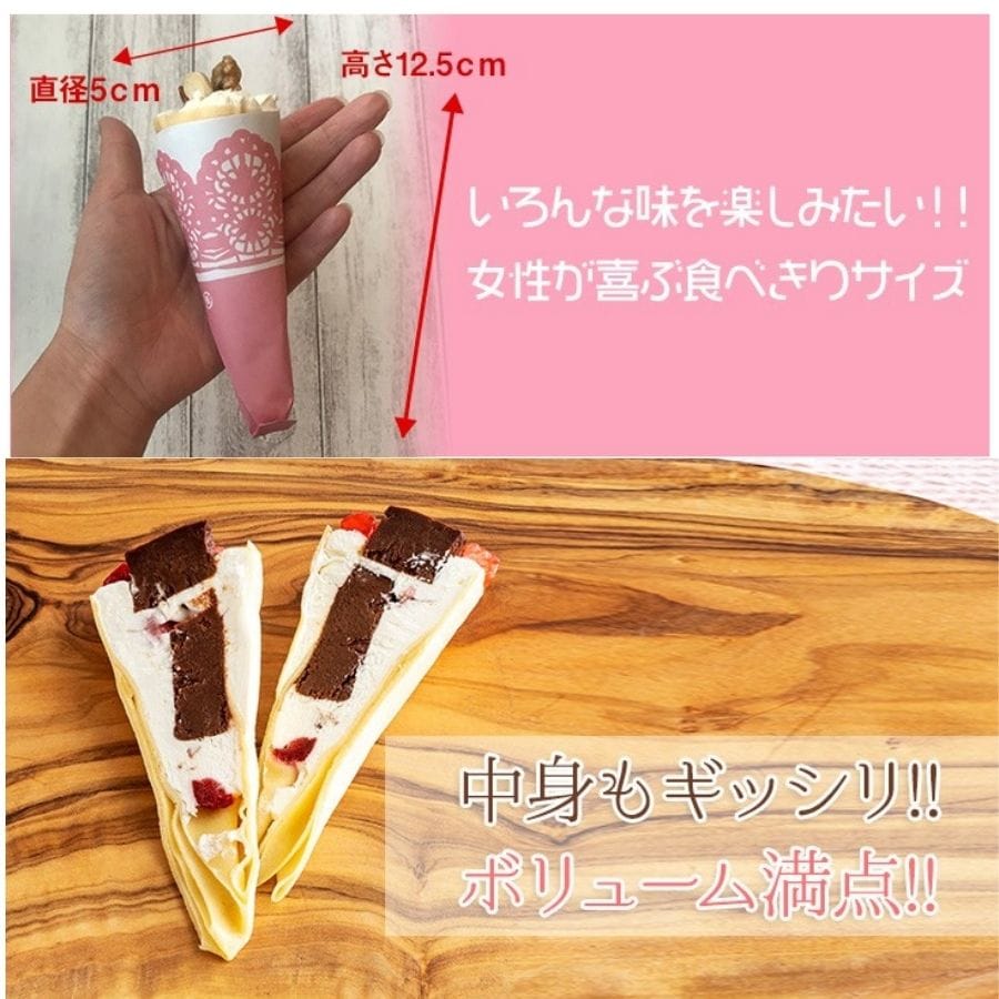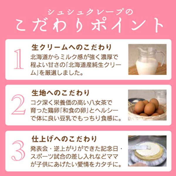 北海道産の生クリームを贅沢に使用した濃厚クリームが特徴の看板商品!ふわっと軽いクレープ生地には、成分無調整豆乳と福岡八女茶で育ったこだわりのブランド卵である「和食のたまご」を使用し、もちもちとした食感を実現しています。