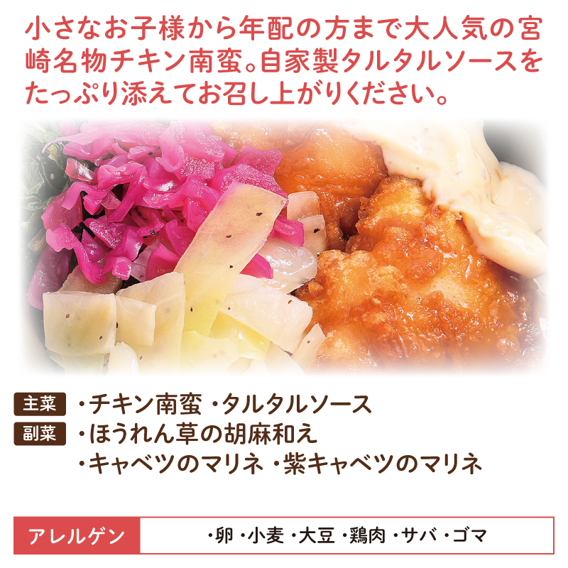 小さなお子様から年配の方まで大人気の宮崎名物チキン南蛮。自家製タルタルソースをたっぷり添えてお召し上がりください。