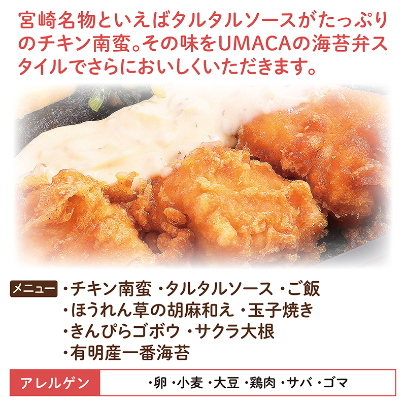 食べやすいミニサイズの海苔弁です。宮崎名物チキン南蛮に自家製タルタルソースをたっぷり添えてお召し上がりください。