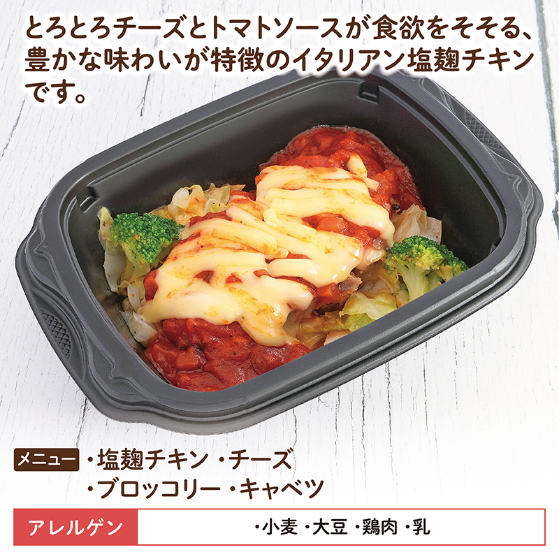 とろとろチーズとトマトソースが食欲をそそる、豊かな味わいが特徴のイタリアン塩麹チキンです。