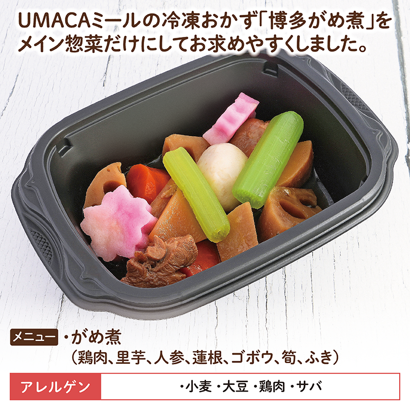 博多の郷土料理がめ煮が主役のお弁当は温かくて優しい味わい。日本料理に精通する料理長の手仕事が美しいUMACAの自信作です。