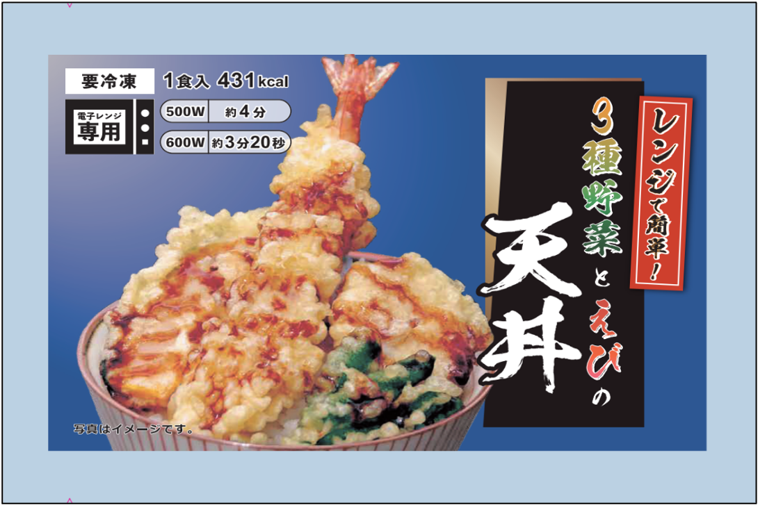 えび、さつまいも、かぼちゃ、いんげんをのせ、さっぱりとしためんつゆたれをかけた食べ応えのある天丼です。 おうちで4種の天ぷらを揚げて作るのは、手間…それを電子レンジだけで頂いてもらいたい!というコンセプト商品でございます。