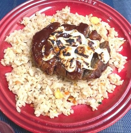 炙りチーズ、ハンバーグ、炒飯 みんな大好きな食べ物をひとつにしました