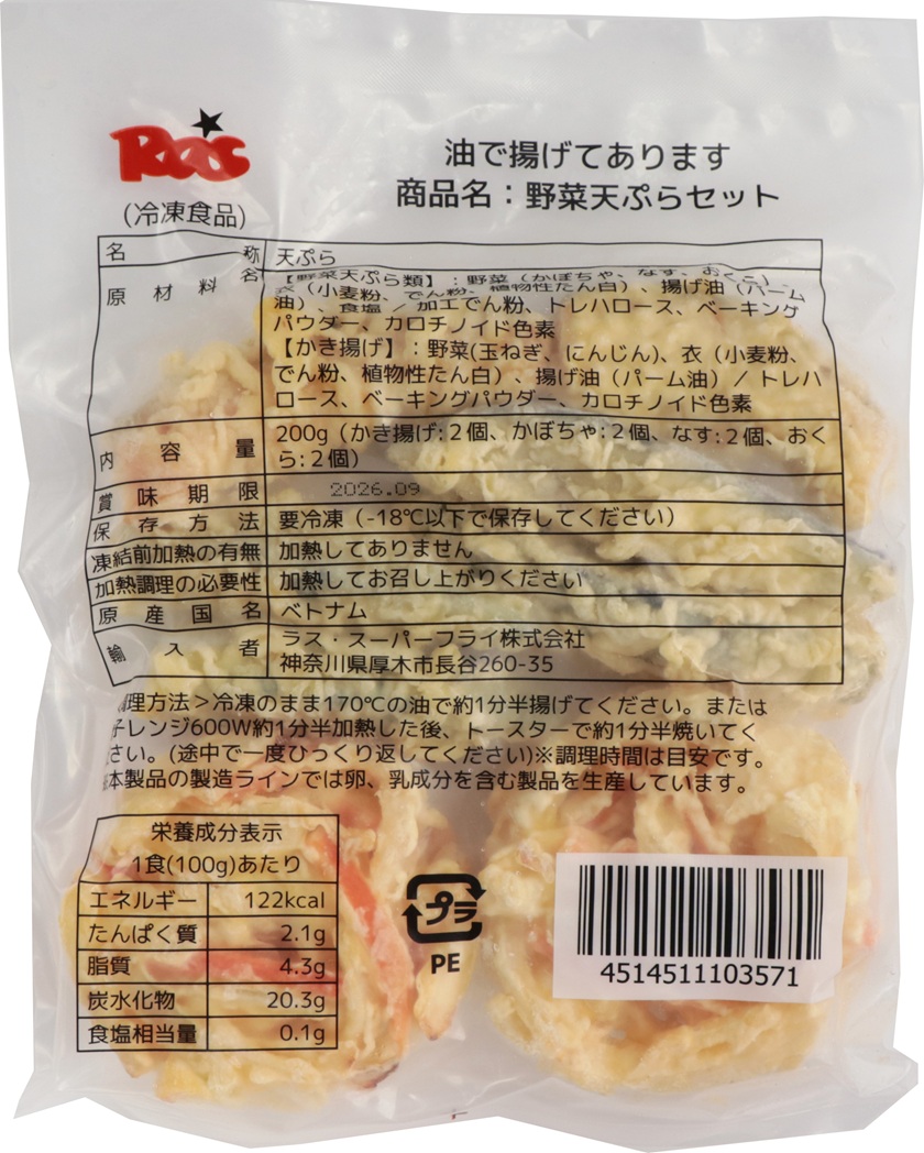 【野菜天ぷら類】:野菜(かぼちゃ、なす、おくら)、衣(小麦粉、でん粉、植物性たん白)、揚げ油(パーム油)、食塩/加工でん粉、トレハロース、ベーキングパウダー、カロチノイド色素【かき揚げ】:野菜(玉ねぎ、にんじん)、衣(小麦粉、でん粉、植物性たん白)、揚げ油(パーム油)/トレハロース、ベーキングパウダー、カロチノイド色素