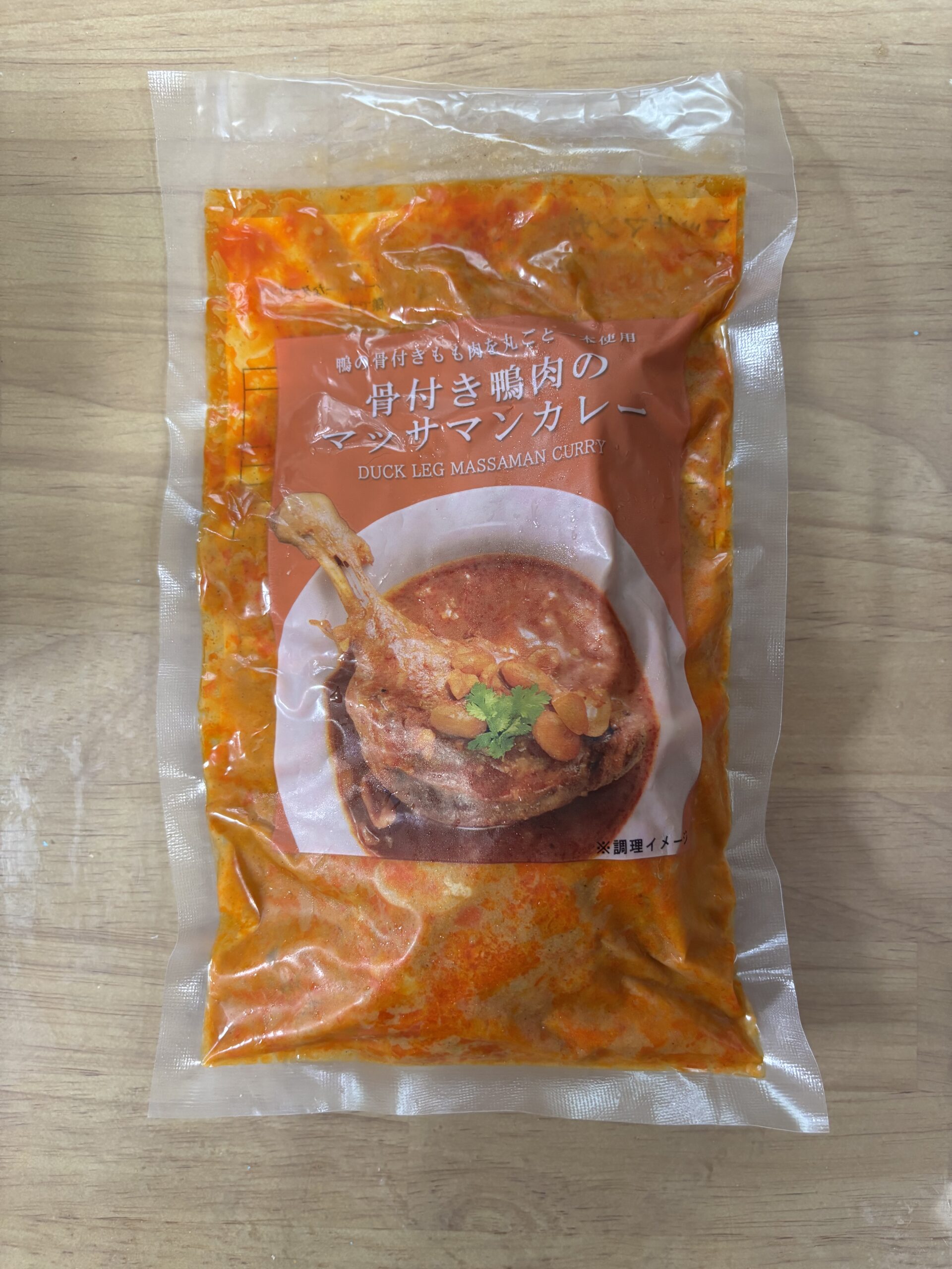 あい鴨骨付きもも肉、ココナッツミルク、カレーペースト、砂糖、ピーナッツ、魚醤、タマリンドペースト/調味料(アミノ酸)、酸味料(一部にピーナッツ・えびを含む)